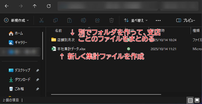 - 統合したいExcelファイル(添付いただいたようなデータ)は、一つの特定のフォルダにまとめて保存されていますか?(例: デスクトップの「売上集計用」フォルダなど)