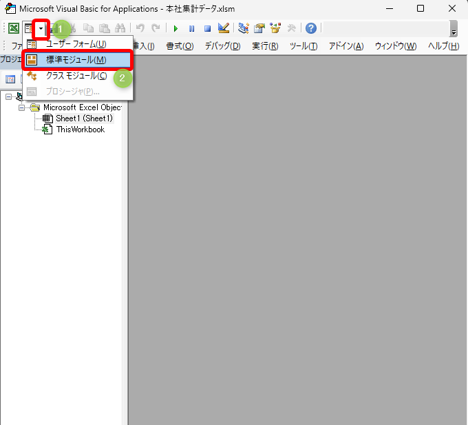 と表示されています)で、[挿入] メニューをクリックし、[標準モジュール] を選択します。