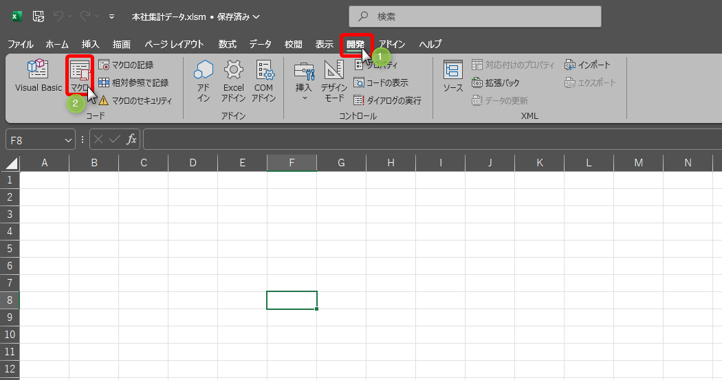 - Excelの画面に戻り、[開発] タブの [マクロ] をクリックします。(または