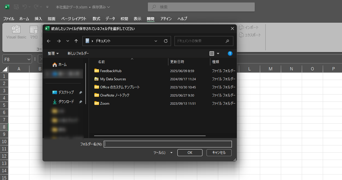 - マクロを実行すると、フォルダ選択ダイアログが表示されるので、統合したいファイルが入ったフォルダを選択します。