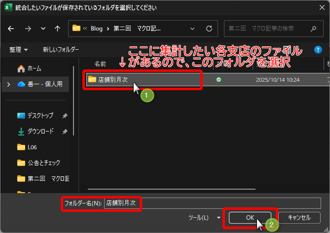 集計したいファイルが入っているフォルダを選択して「OK」を押す。