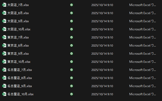 ※ 前提として、各支店のファイルは同じフォーマットであること(行・列がバラバラ、タイトル行の文字がバラバラだとコードが複雑化したり、そもそも自動集計ができなくなったりします。)