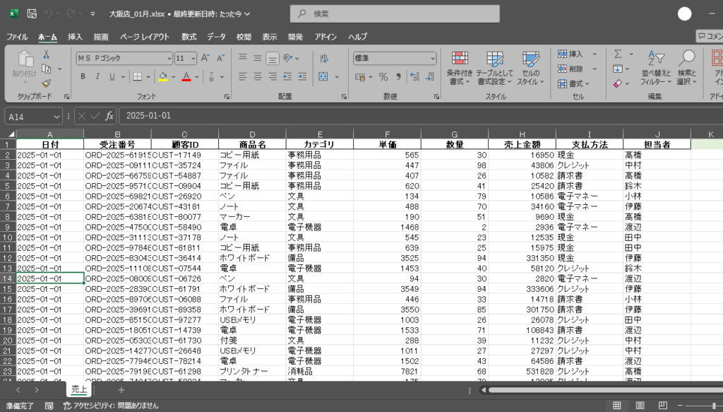 各支店の売上データが入ったExcelファイルが毎月送られてくる(添付のファイルのようなデータが、毎月送られてくる)