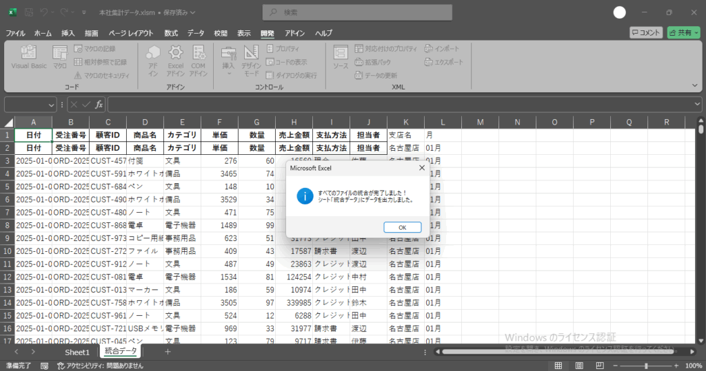 など)を自動で見つけます。 - 各ファイルを開き、中身の売上データを、マクロを実行したファイル内の新しいシートに次々とコピー&ペーストして統合します。