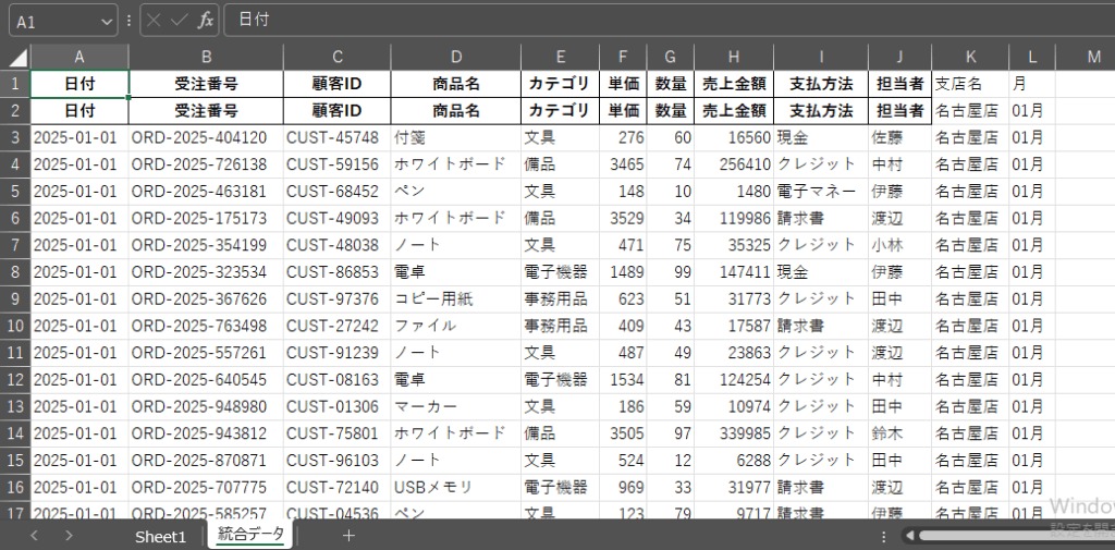 )から**「支店名」と「月」**の情報を自動で抽出し、統合データに新しい列として追加します。
