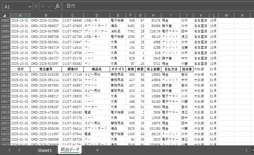 下の行までずーっとスクロールすると、名古屋店1月→2月→3月→・・・の順にデータが入っていました。そして10月(今回用意しているのは10月までなので、実質最新月)までくると、大阪店の1月が始まっています。ここでまた問題点。画像を見てわかる通り、大阪店に切り替わるタイミングでまた、タイトル行が表示されています。コードの中身はわかりませんが、おそらく支店ごとに最初の行にタイトル行を抽出して表示するようになっているのかも。(ほかの支店も最初の行でタイトル行が表示されていました。)