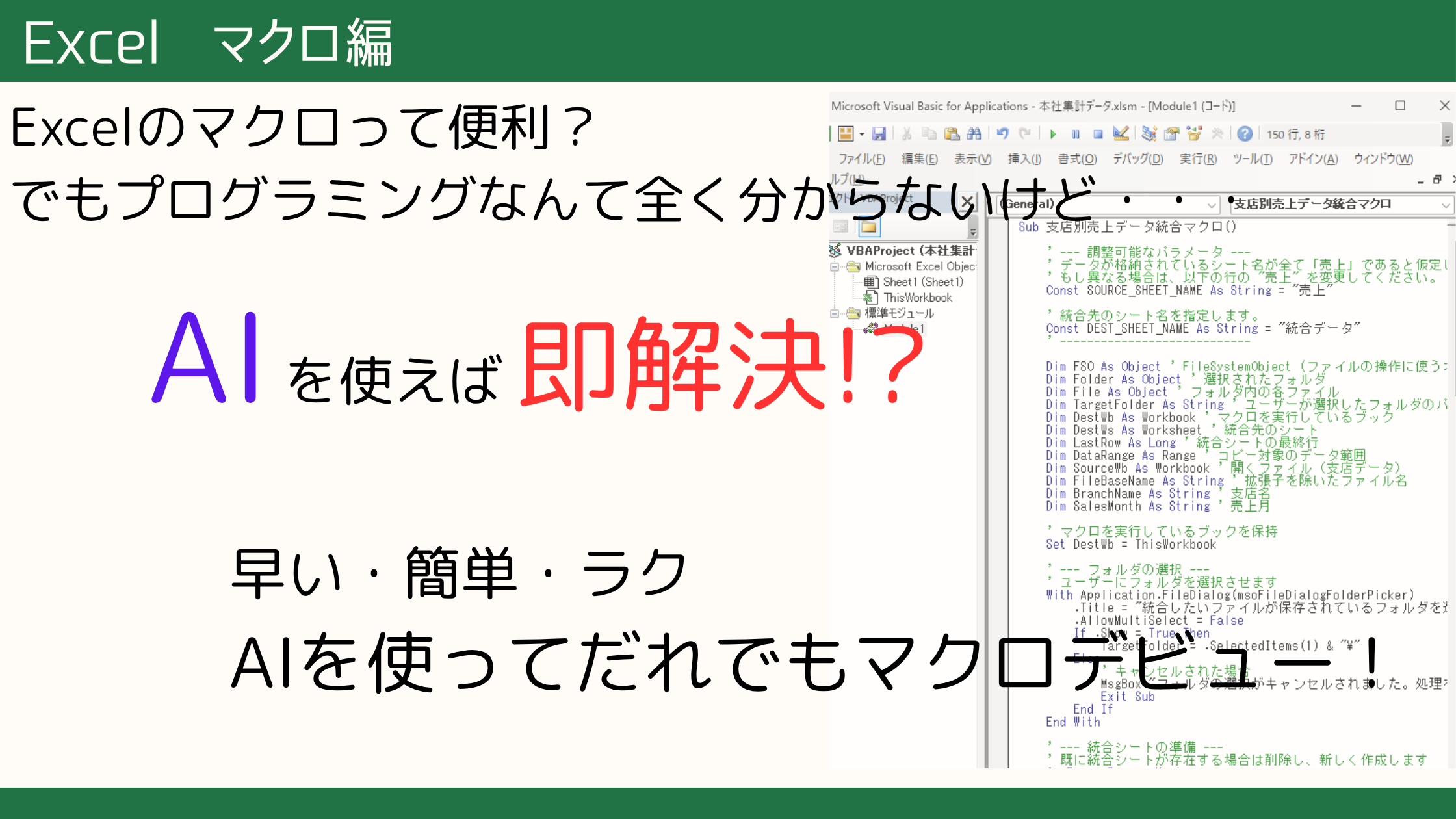 お客様の目標は、毎月送られてくる複数の支店売上データを自動的に一つのファイルに統合し、集計しやすい状態にすることですね。これはExcelマクロ(VBA)の得意なタスクです!