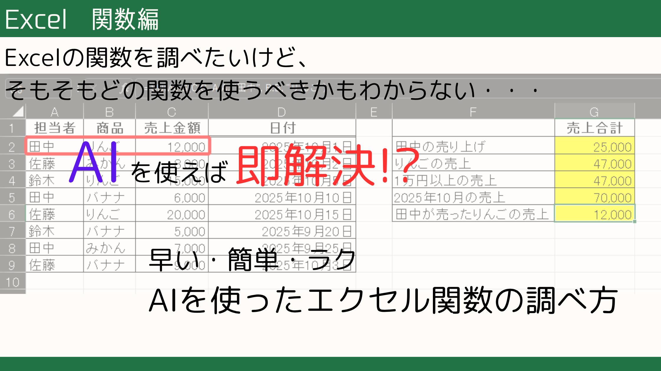 今の時代は、AIに“やりたいこと”をそのまま伝えるだけで、最適な関数を提案してくれる ようになっています。