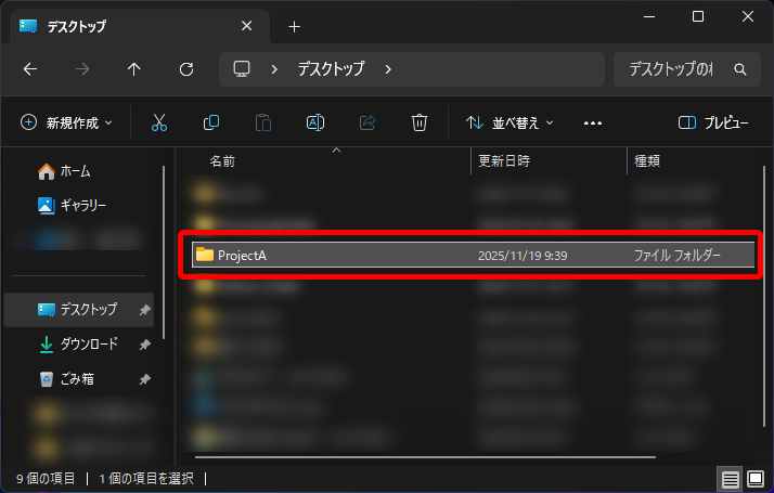 今回は説明のための具体例として、デスクトップ上にあるフォルダで進めていきます。