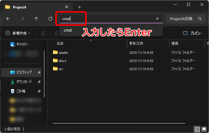 フォルダのアドレスバーに cmd と入力して Enter を押すと、