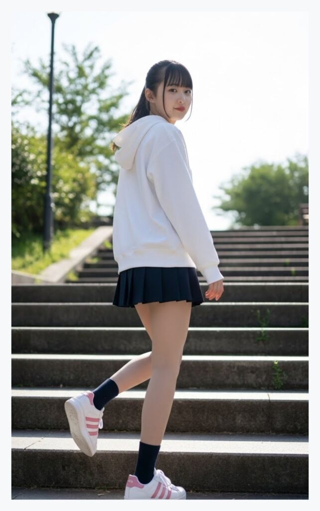 彼女の若々しいスタイルと、階段を上っていく様子が映える、